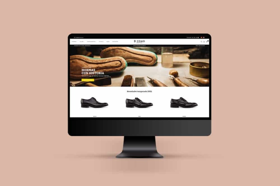 Aquest exemple de disseny de botiga online el podem veure amb DComo. Són una sabateria que té els seus origens en un petit taller de calçat de Mallorca d’on van poder salvar de la destrucció tot un seguit de motlles antics, els quals han fet servir de base per innovar i seguir fabricat calçat de qualitat. Però per fer aquest salt avui en dia cal disposar d’un canal de vendes que ens permeti arribar arreu del món, siguin on siguin els nostres clients. I per aconseguir això es fa impensable no disposar d’una botiga online. En aquest cas, una botiga Shopify auto-gestionada pel propi client. És una plataforma molt fàcil de fer anar i de mantenir. A més, es sincronitza amb altres canals de venda digitals com puguin ser Facebook, Instagram, Google Shopping, Tik-tok, etc.